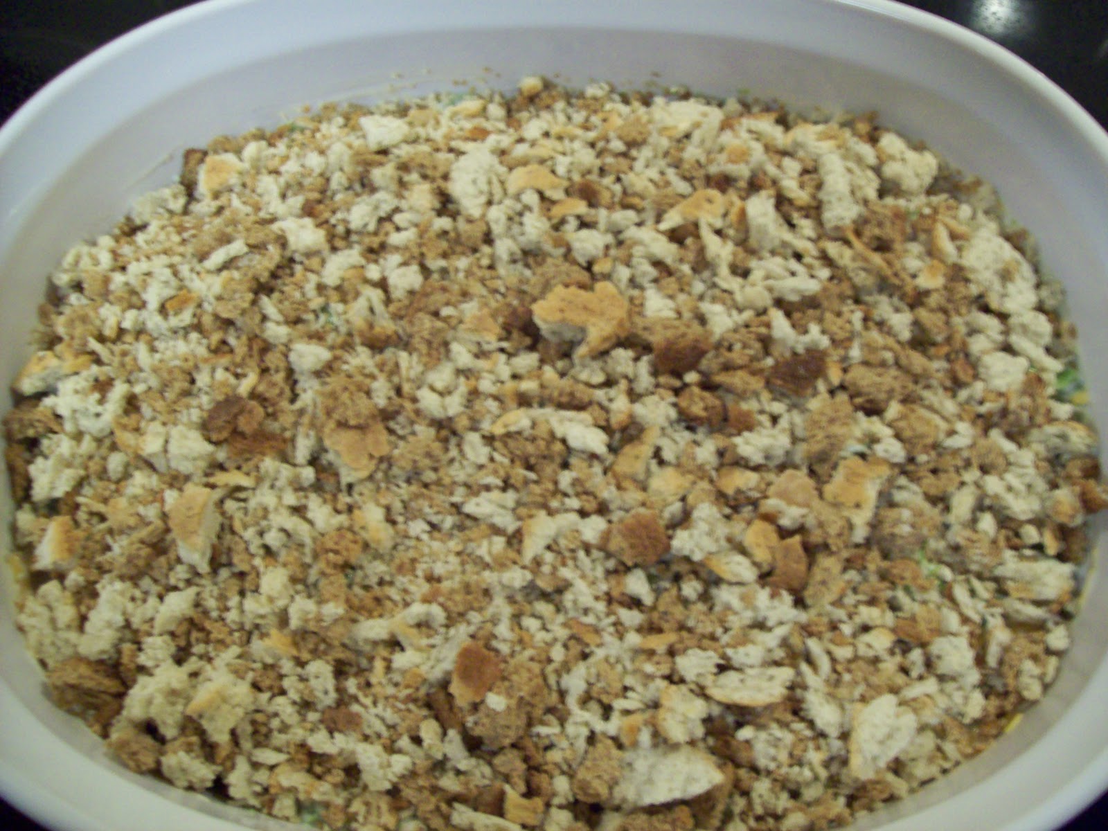 As you can see, I just dumped the ingredients, except for the stuffing mix and butter, right into the casserole dish on top of the cooked broccoli.