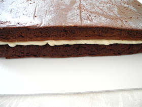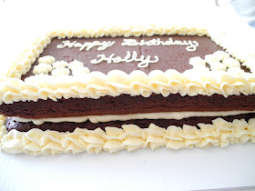 This is a birthday cake I made recently. It is absolutely yummy. I made it using two layers of these brownies without the nuts. To do this you need to double the recipe and bake it in a 9" x 13" pan, twice. Yes that is right, four recipes altogether. And, yes that is two whole pounds of premium chocolate. I didn't say it was cheap or low calorie... And, I have made it with a sandwich cookie pan using one recipe for each layer, but we needed more this time. In between the two layers is one recipe of the center filling you find in Oreo ball recipes. Really it isn't a recipe, it is just one package of oreos blended in the food processor with one 8oz. package of cream cheese.
